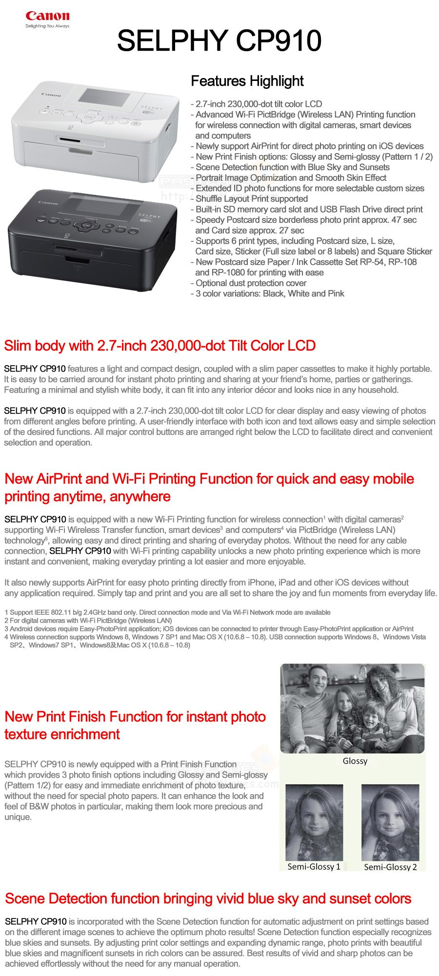 The Canon SELPHY CP910 Wireless Compact Photo Printer offers high quality wireless printing up to 4 x 6" in a convenient, compact form factor. The CP910 utilizes a dye sublimation process to produce images, resulting in water-resistant archival prints rated for up to 100 years.