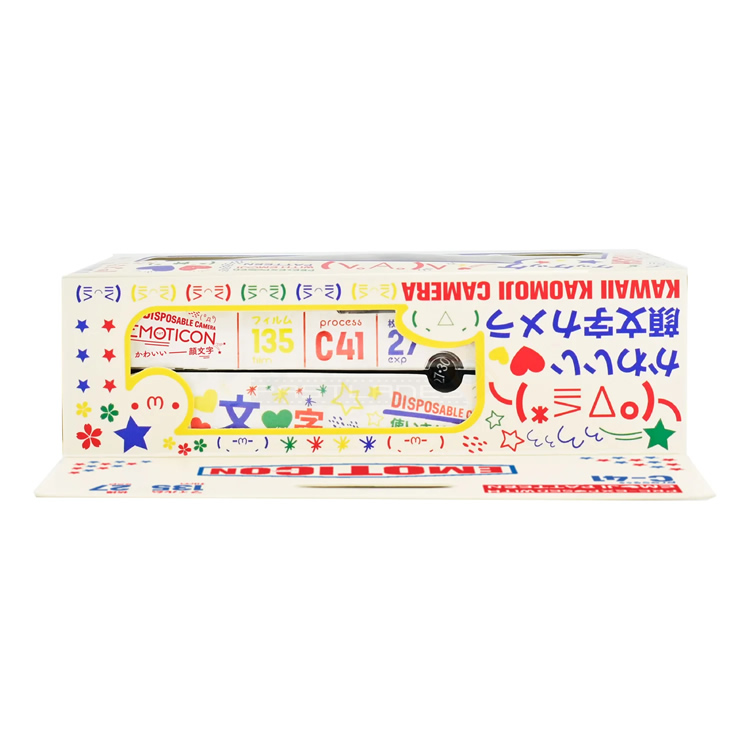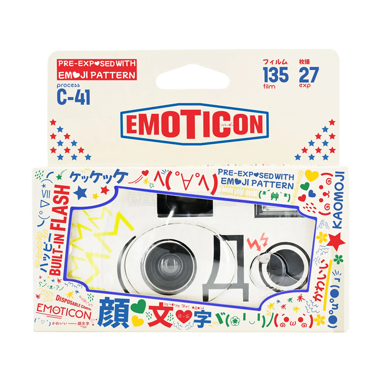 Retocolor Emoticon 35mm Disposable Film Camera with 27 exposures, features pre-exposed patterns of cute emojis and kaomojis in vibrant colors, showcasing a wide range of lovely facial expressions. With its built-in flash and pre-loaded iso 400 film, it could be shot indoors and outdoors, and be your pocket camera for capturing fun moments.