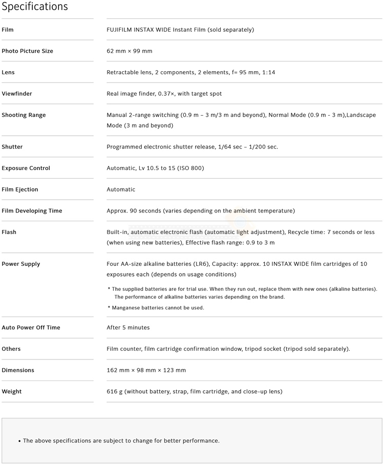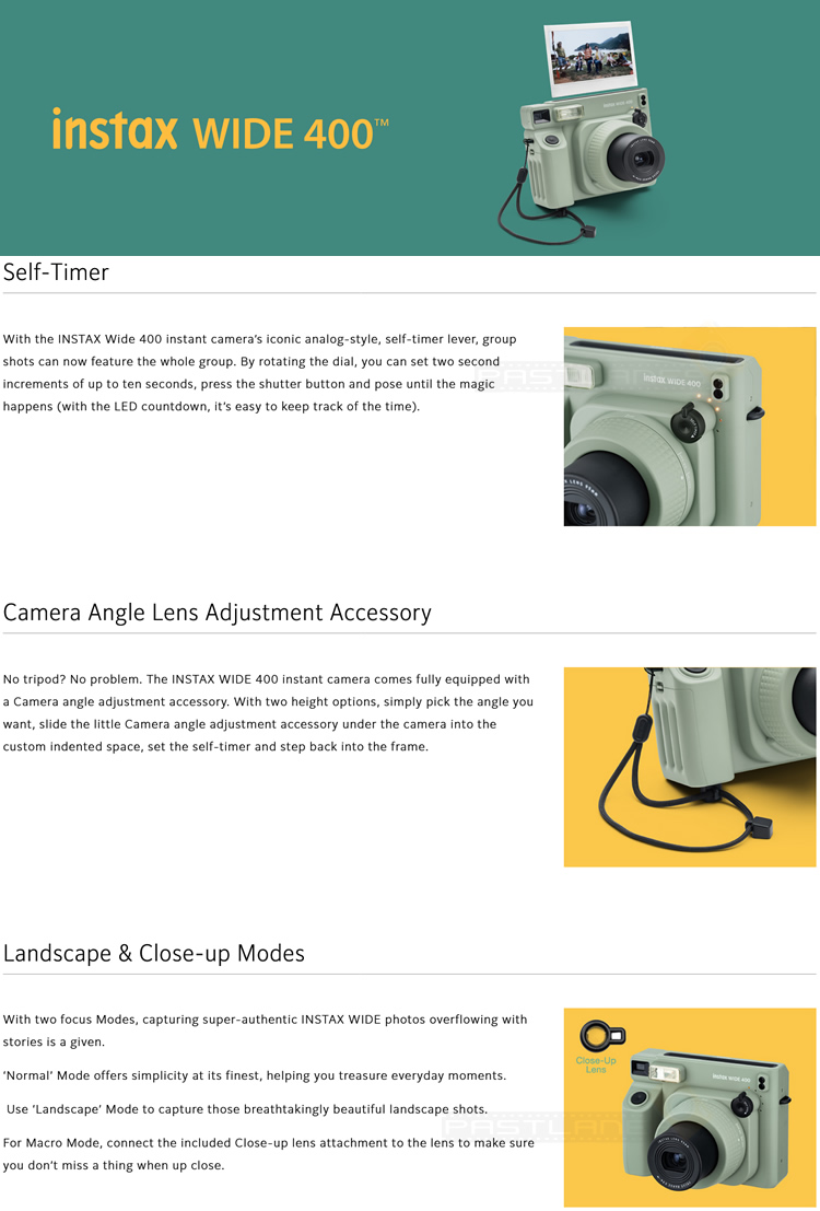 The INSTAX WIDE 400 Instant Camera, a reimagined WIDE format instant camera that lets you explore all things wide. Featuring Automatic exposure and Flash control, the INSTAX WIDE 400 Instant Camera takes high-quality images, while you focus on filling the wide frame to perfection.