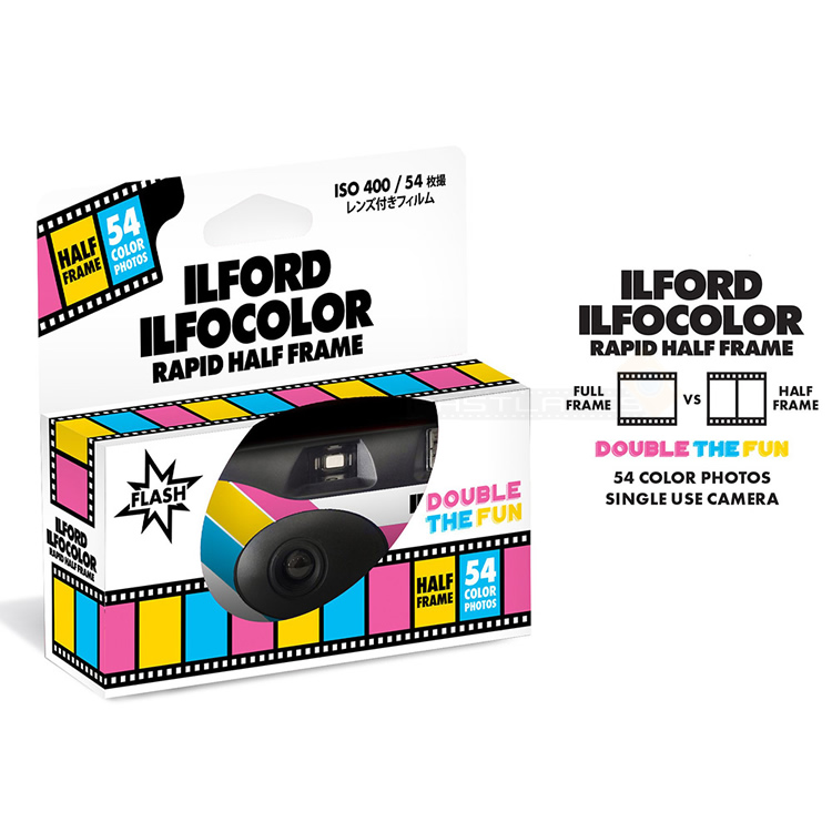 The ILFORD ILFOCOLOR Rapid Half Frame camera is pre-loaded with 35mm 400 ISO film and produces 54 exposures. As exposures are in portrait format (with the camera held conventionally), the ILFOCOLOR Half Frame makes for easier viewing of scanned photos on portrait-oriented mobile devices.