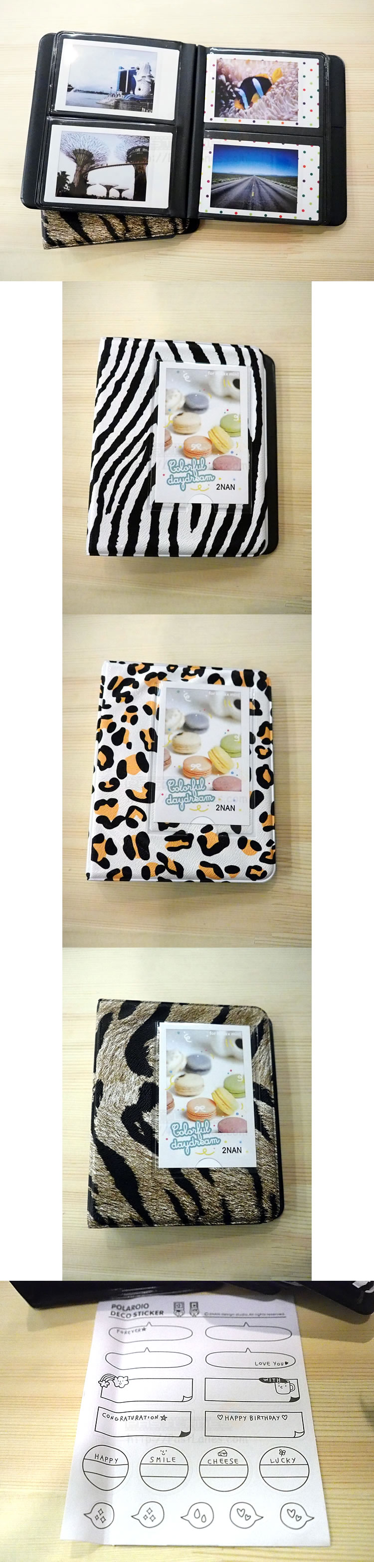 Album has 16 pages, 2 pockets per page and can hold up to 64 mini photos. There is an additional slot at the front cover. Include 1 sheet of stickers.