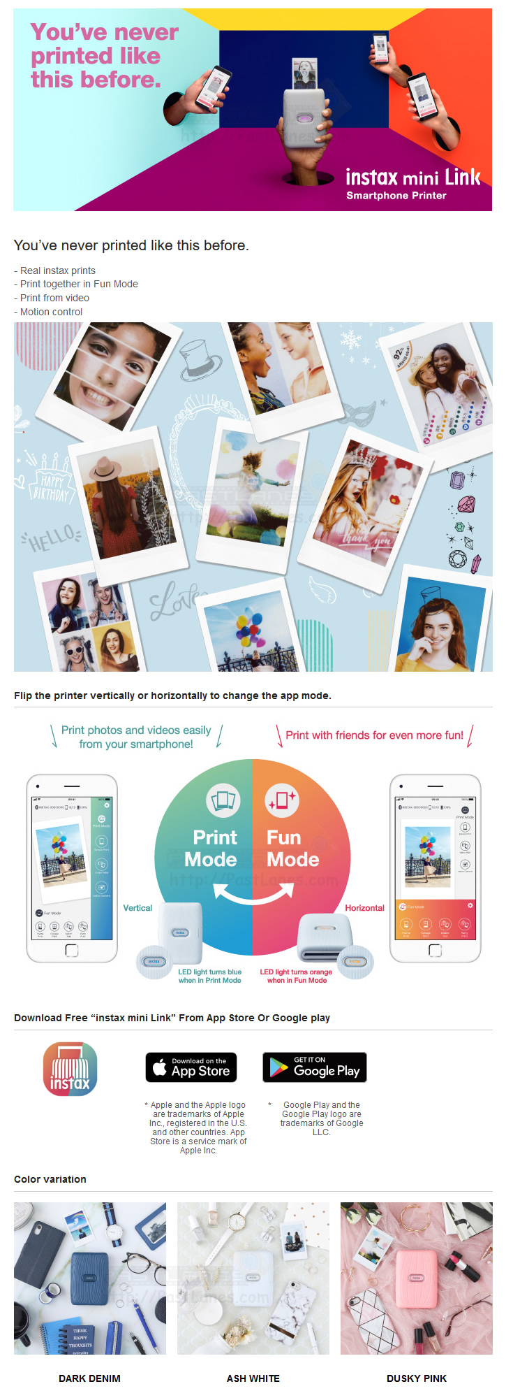 Built as a successor to their Instax Share SP-2 Smartphone Printer, Instax Mini Link Smartphone Printer from Fujifilm features a sleek and light body design, a 12 second print time, a revamped Instax Mini Link app, social features, and Bluetooth connectivity. Its downloadable app will allow users to customize their photos with close to 30 fun and colorful frames, create colleges and split prints, and print photos from videos. The app also has two modes - Print Mode and Fun Mode. Fun Mode lets users connect up to five smartphones to the Instax Mini Link and print a photo collage with Party Print or discover their compatibility with others using the Compatibility Test. Motion Sensor functionality lets users zoom in or out to take a photo with the app by tilting the printer, and photos can be reprinted by turning the printer upside down and pressing the Instax button.