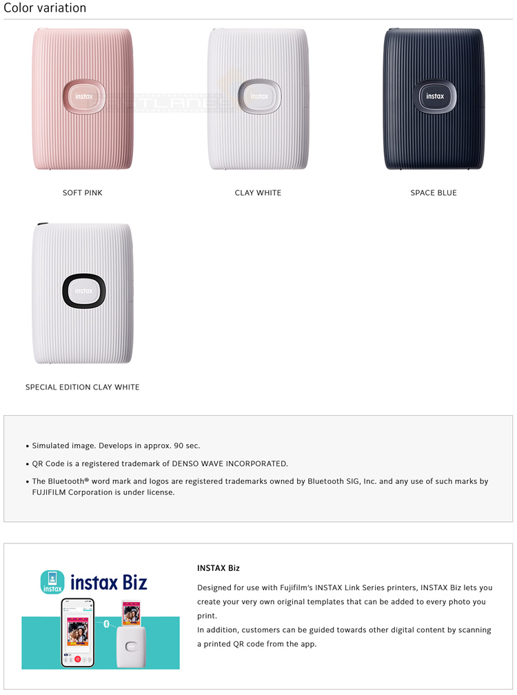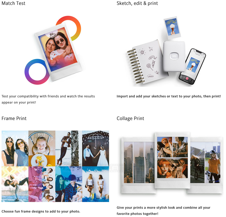 The Link Series of smartphone printers has been embraced by the young generation around the world for their ability to connect with a smartphone through a dedicated app using Bluetooth and print images stored in the smartphone onto instax films anytime and anywhere, in high quality. The Link offers more ways to enjoy photographs with friends, such as the “Match Test” function, first introduced in the instax mini Link released in October 2019, which can print user’s compatibility with a friend or someone special, and the “Video Print” function that allows users to choose the best frame from a video and print it out.