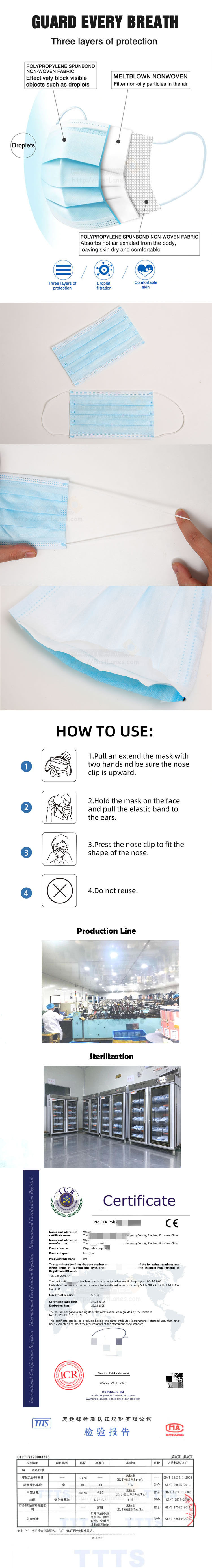 CE certified 3 ply face mask for general public use (not tested or certified by authority for surgical/medical use). Consist of high quality 2 outer layers non woven water repellent fabric and inner filter layer made of melt blown fabric to provide highly effective filtration of dust, bacteria, virus and other sub-micron particles. Our face mask are also sterilized by factory for your safety. Water and burn tested.