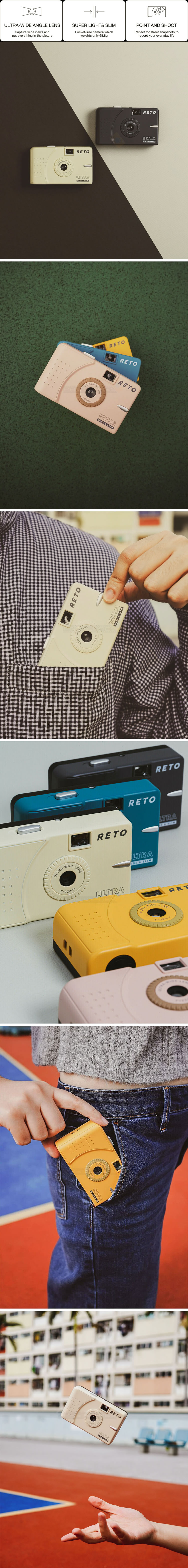 Ultra-Wide & Slim 35mm Film Camera from Reto Project is a fun and easy-to-use film camera for general use. Perfect for outdoor parties, celebrations, and daylit scenes, the camera has a versatile fixed-focus wide-angle lens. Compatible with 35mm color or black and white film, this camera allows you to quickly capture candid snapshots as well as portraits and moody monochrome scenes. Designed for simple operation, the camera has a manual film advance winding lever to move through each exposure and rewind the roll when the film is finished.