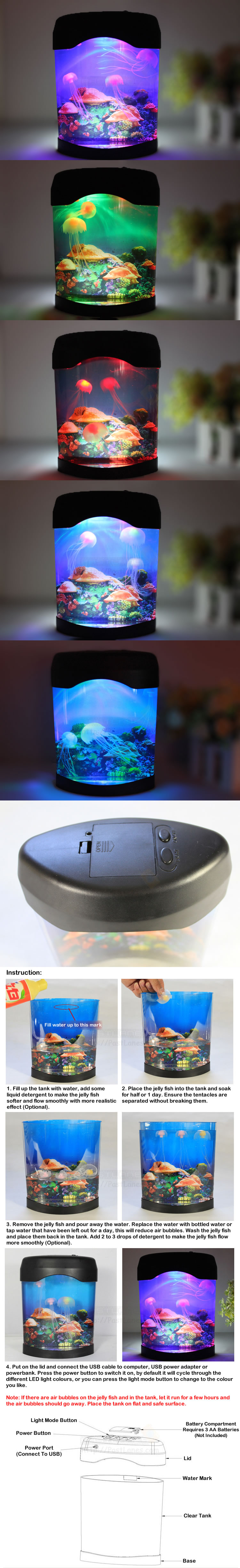 Do you have a dull work desk or home decoration? This water tank will definitely spice up your environment with realistic moving jelly fish inside! Powered by 3 AA batteries or use the provided USB cable, it is low power consumption. Unlikely a real fish tank, there is no maintenance required!