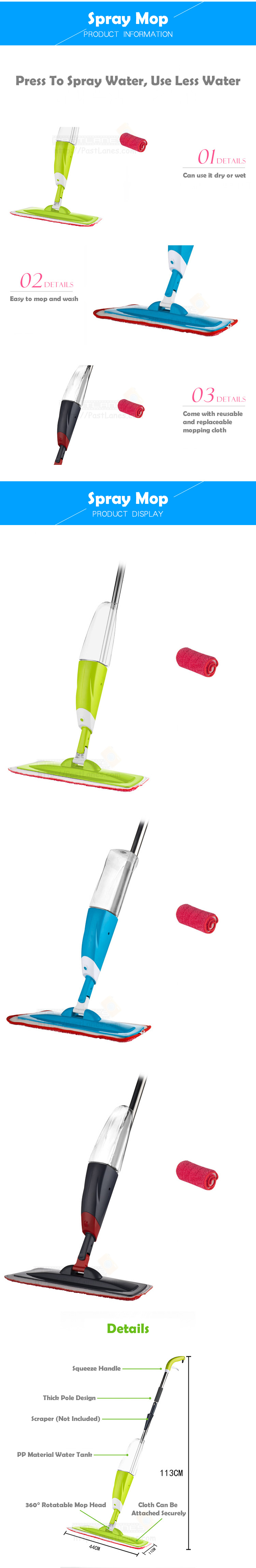 Simply fill up the water tank and squeeze on the handle to spray water on the floor and mop it with the replaceable and washable cleaning cloth. Unlike the traditional mop, you no longer need a bucket of water. Spray mop use less water, less water splash around and can allow the floor to dry faster.